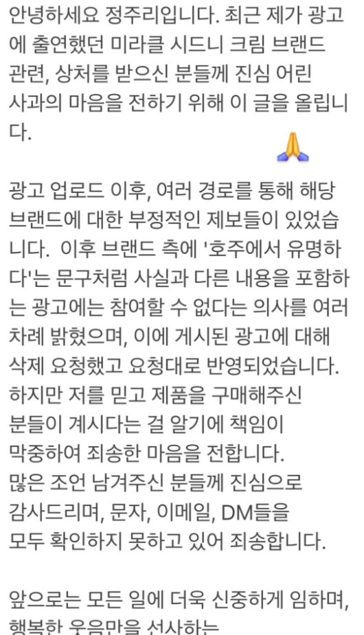 그는 “광고 업로드 이후 여러 경로를 통해 해당 브랜드에 대한 부정적인 제보를 받았다”며 “특히 ‘호주에서 유명하다’는 문구처럼 사실과 다른 내용을 포함한 광고에는 참여할 수 없다는 의사를 수차례 전달했고, 해당 광고의 삭제를 요청해 반영됐다”고 설명했다.