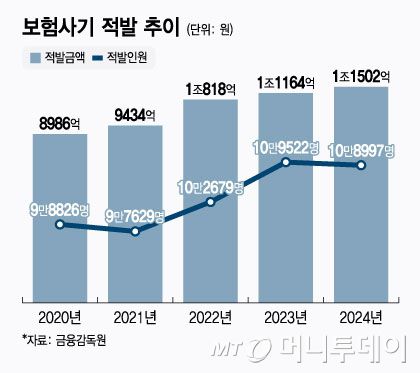 금융감독원에 따르면 지난해 보험사기 적발 금액은 총 1조1502억원으로 사상 최대치를 기록했다. 이 가운데 자동차보험이 49.6%, 장기보험이 42.2%를 차지하며 전체의 90% 이상이 해당한다. 주요 사기 유형은 사고내용 조작 58.2%, 허위 사고 20.2%, 고의 사고 14.7% 순이다.
