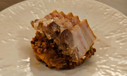 <만들기> ① 돼지 고기는 수육 재료를 넣고 1시간 30분 뭉근히 삶아 준다. ② 냄비에 버터를 두르고 김치, 양파, 마늘을 볶아준다. 스톡을 넣고 끓이다 밥을 넣어준 후 굴소스로 간을 한다. ③ 참기름으로 향을 내고 접시에 담아 준 후 수육을 얹어준다.