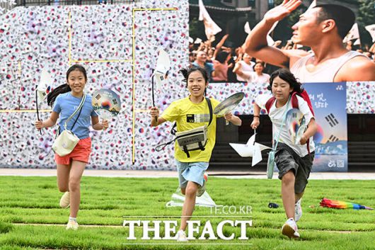 [더팩트ㅣ서예원 기자] 9일 서울 중구 서울광장에 조성된 광복기념행사에 방문한 어린이들이 태극기 바람개비를 들고 즐거운 시간을 보내고 있다.