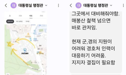 신혜식 신의한수 대표에게 지난 1월3일 성삼영 당시 대통령실 시민사회수석실 행정관이 보낸 문자메시지 내용을 9일 보면, 성 전 행정관은 신 대표에게 지도 이미지까지 첨부해 당시 관저 주변에 모여있던 윤 전 대통령 지지자들의 ‘대비 위치’를 지시한다. 1월3일은 윤 전 대통령에 대한 1차 체포영장 집행이 실패한 날로, 관저 주변에는 윤 전 대통령 지지자와 조속한 체포를 촉구하는 단체들이 남아 집회를 이어가고 있었다.