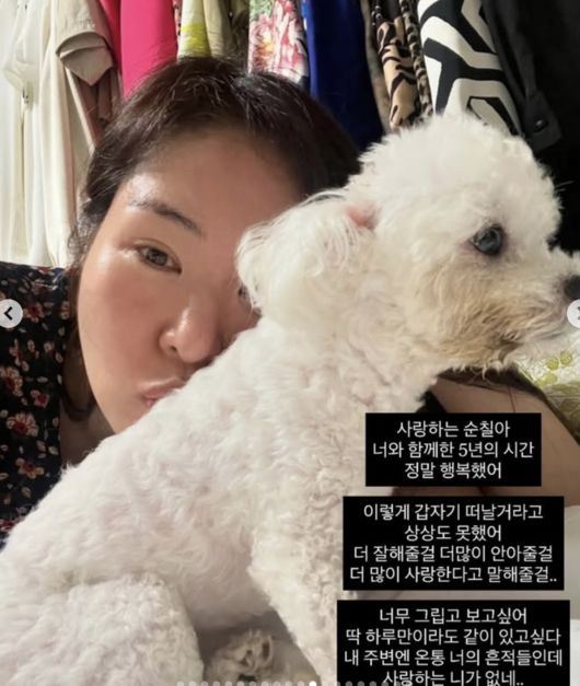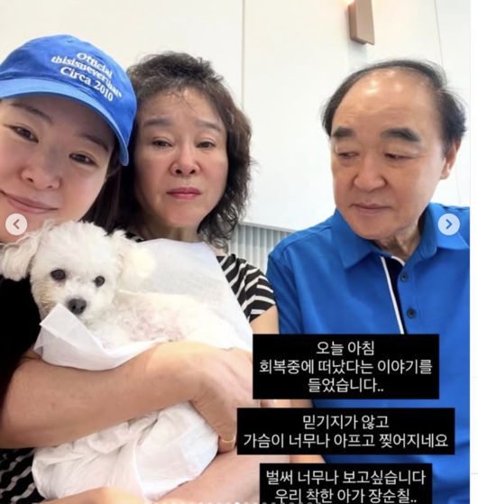 [OSEN=최이정 기자] 방송인 미자가 반려견 순칠이의 갑작스러운 죽음을 전하며 깊은 슬픔을 드러냈다.