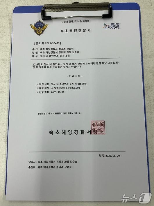 9일 속초해양경찰서에 따르면 최근 속초해경서 명의와 공식 문서 양식을 도용해 ‘청사 내 흡연부스 철거 계획’이라는 제목의 허위 문서가 지역 내 업체에 전달됐다.