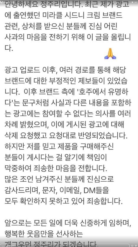 정주리 역시 지난 8일 SNS를 통해 "광고 업로드 이후 해당 브랜드에 대한 부정적인 제보를 여러 경로로 접했다"며 사과했다. 그는 "브랜드 측에 호주에서 유명하다는 문구처럼 사실과 다른 내용을 포함한 광고에는 참여할 수 없다는 뜻을 여러 차례 밝혔다"며 "저를 믿고 제품을 구매해주신 분들이 계시다는 걸 알기에 책임감이 막중하다"고 덧붙였다.