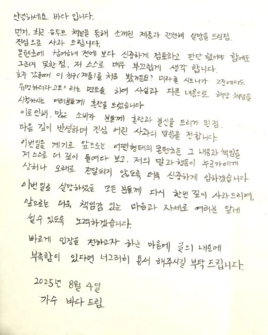 논란이 확산되자 바다는 지난 5일 유튜브 채널을 통해 "사실과 다른 내용으로 해당 채널을 시청하시는 여러분께 혼란을 드렸다"며 자필 사과문을 올렸다. 그는 "많은 소비자분께 혼란과 불신을 드리게 된 점 마음 깊이 반성하며 진심 어린 사과의 말씀을 전한다"고 밝혔다.