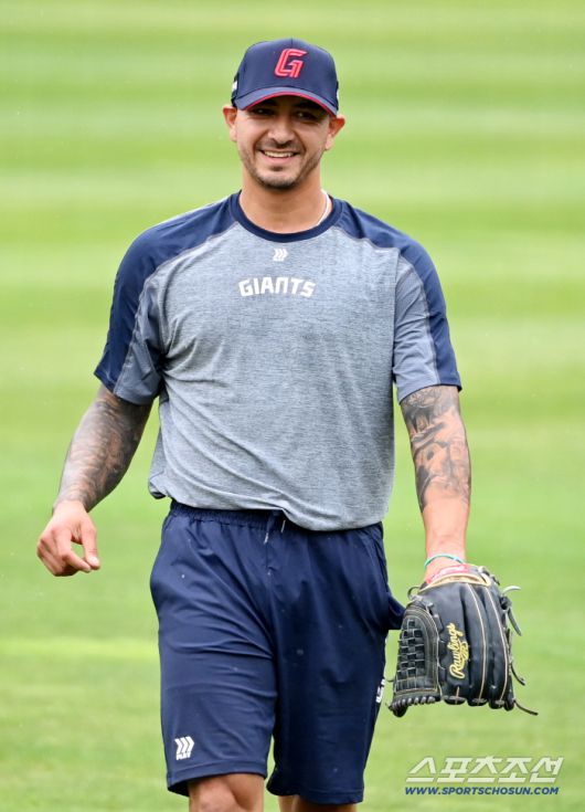 이날 불펜 피칭이 예정된 새 외국인 선수 빈스 벨라스케즈만 외야에 남았다. 벨라스케즈는 가볍게 캐치볼을 하며 몸을 풀었다.