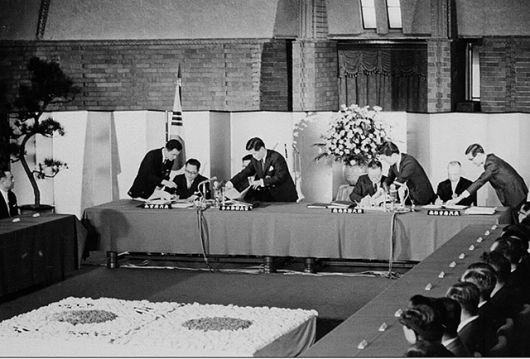 ▲ 일본 총리 관저에서 한일기본조약 및 부속 협정에 서명하고 있는 한일 양국 대표들. ⓒ 국사편찬위원회 |