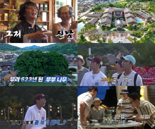 한편 독박 게임을 끝낸 이들은 저녁 식사를 먹기 위해 근처에 있는 ‘운수요’ 마을로 향한다. 장동민은 “중국 영화 ‘운수요’ 촬영지인 곳인데 영화가 대박 나서 관광지로 급부상했다”고 설명하고, 자연과 전통이 공존하는 고즈넉한 ‘운수요’의 풍광에 ‘독박즈’는 “너무 예쁘다”고 입을 모은다. 특히 마을 중심에 있는 623년 된 ‘부부 나무’를 본 ‘독박즈’는 ‘연인들의 포토 스폿’으로 유명하다는 설명에 ‘인증샷’ 릴레이에 나선다. 촬영일 기준, 결혼식을 일주일 앞둔 김준호는 가장 먼저 포즈를 취하면서 “행운이 깃들 것 같아”라고 읊조린다. ‘독박즈’와는 잘 사진을 찍지 않아 원성을 샀던 유세윤 역시 “나도 찍을래”라며 인증샷 행렬에 동참해 훈훈함을 더한다.