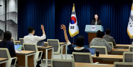 강유정 대통령실 대변인이 9일 서울 용산 대통령실 청사에서 산재 관련 대통령 지시사항 등에 대한 브리핑을 마친 뒤 취재진 질문을 받고 있다. 연합뉴스 |