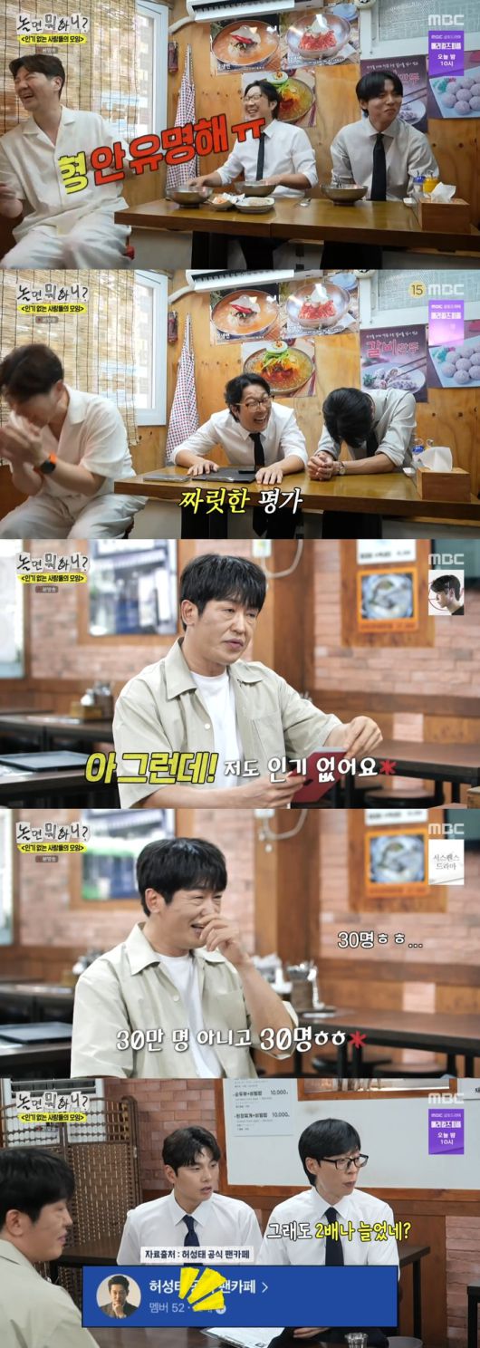 초대장을 받은 허성태는 당황하다가 “아 근데! 저도 인기 없어요. 팬카페에 30명 있어요”라고 인정했다. 알고 보니 팬카페 회원은 52명, 허성태는 “저는 인삼도 받아 봤어요”라며 감사함을 표했다.