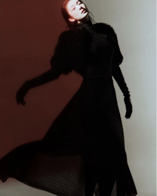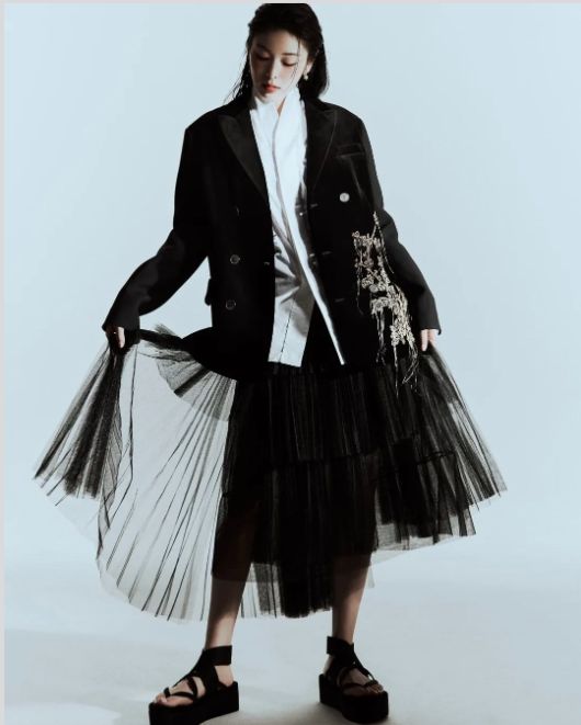 다른 컷에서는 셔츠와 재킷 위로 시스루 스커트를 더해 모던한 분위기를 완성했다.