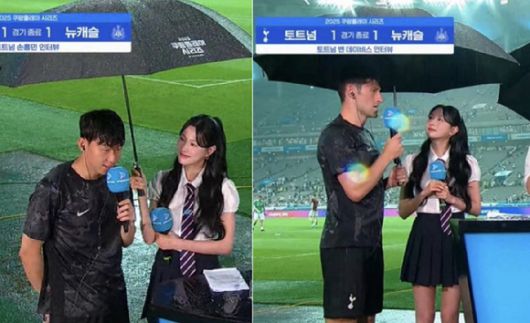 당시 여성 인터뷰 진행자였던 걸그룹 에이핑크 오하영은 인터뷰 중인 손흥민을 위해 우산을 씌워주고 있었다.