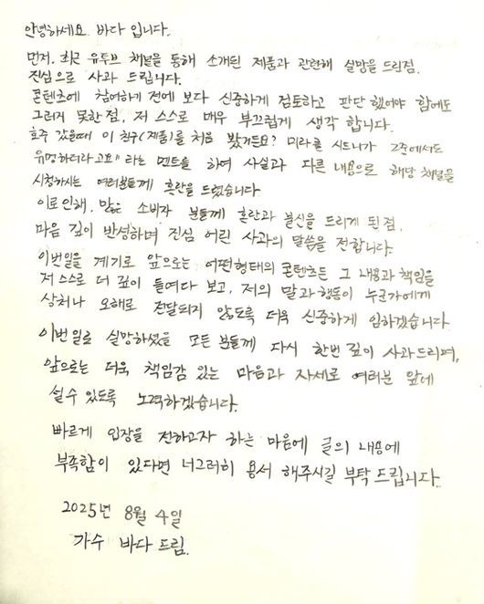 바다는 5일 자필 사과문을 통해 "콘텐츠에 참여하기 전에 보다 신중하게 검토하고 판단했어야 함에도 그러지 못한 점, 저 스스로 매우 부끄럽게 생각한다"며 "이로 인해 많은 소비자 분들에게 혼란과 불신을 드리게 된 점, 마음 깊이 반성하며 진심 어린 사과 말씀을 전한다. 이번 일을 계기로 앞으로는 어떤 형태의 콘텐츠든 그 내용과 책임을 저 스스로 더 깊이 들여다 보고 저의 말과 행동이 누군가에게 상처나 오해로 전달되지 않도록 더욱 신중하게 임하겠다"고 전했다.