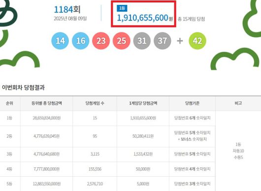 1184회 1등 당첨번호 '14, 16, 23, 25, 31, 37'···보너스 번호 '42'