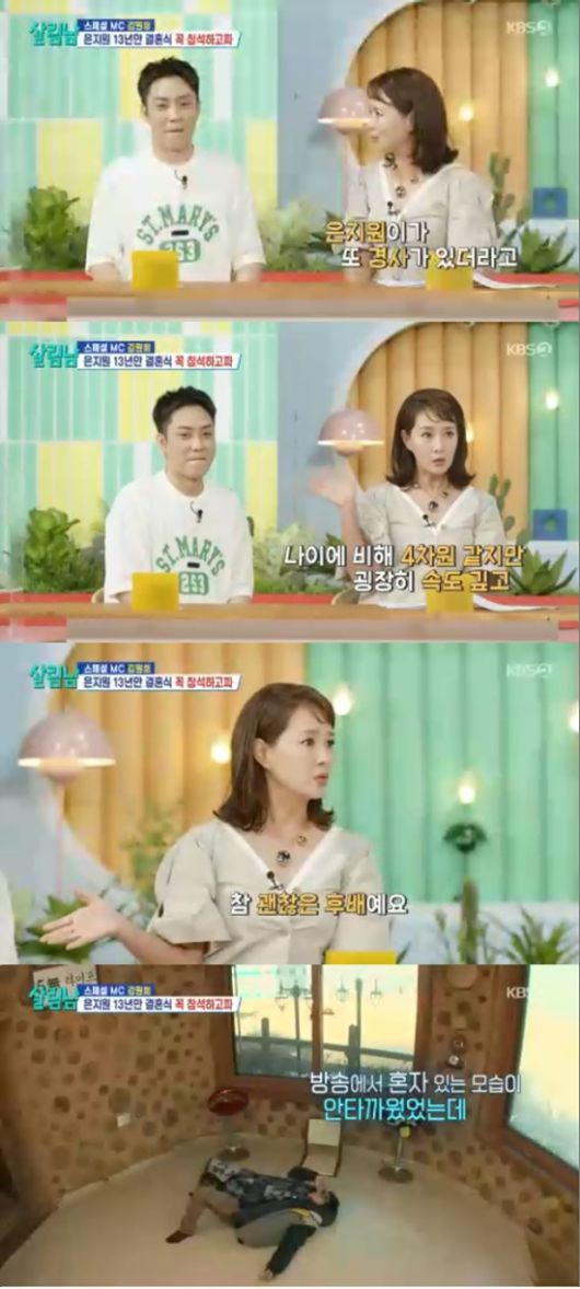 김원희는 은지원의 재혼 소식을 언급하면서 "경사가 있더라. 할 때가 됐다고 생각했다. 겉으로는 4차원 같지만 속도 깊고 참 괜찮은 후배였다"고 말했다.
