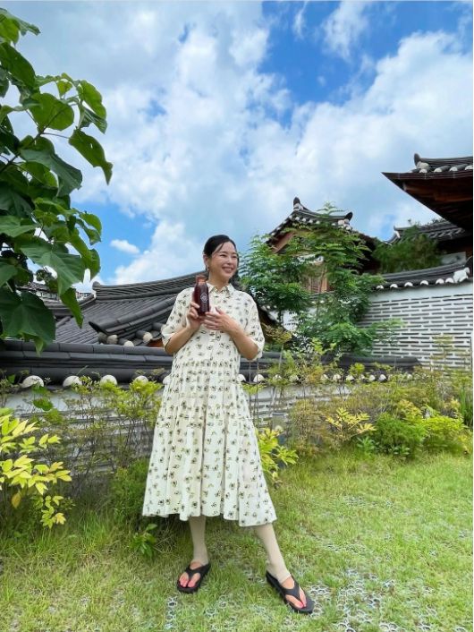 공개된 사진 속 그는 고즈넉한 한옥 마당에서 제품을 손에 들고 포즈를 취했다.