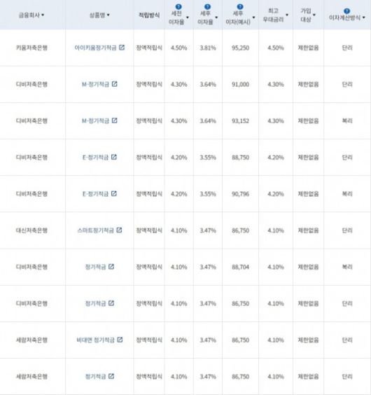 이어 DB저축은행의 'M-정기적금'이 4.30%의 세전이자율을 제공하며 뒤를 이었다.