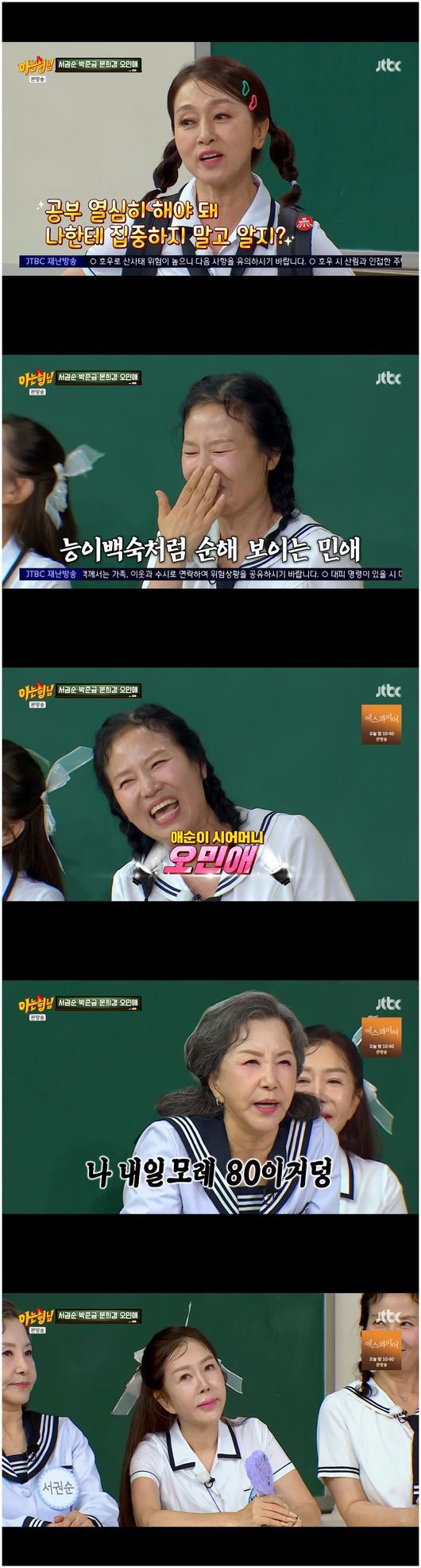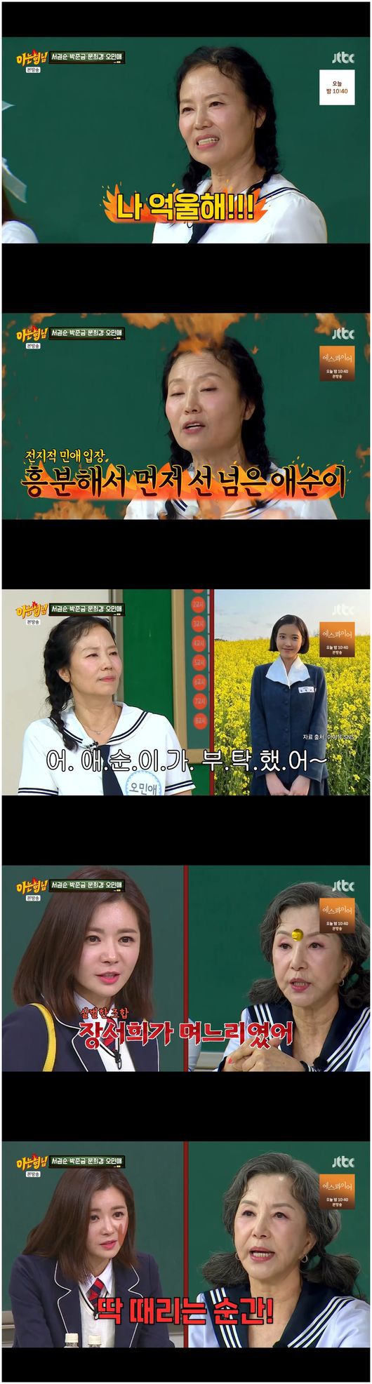 오민애는 “난 억울해. 제삿상을 치르는데 가장이 제삿상을 때리는데 거기서 애기 며느리가 제삿상을 엎으면 눈이 안 돌겠냐”라며 아이유를 때린 시어머니로 기억되는 걸 다소 억울해 했으나, 서장훈은 “엎을 만하던데”라며 조용히 반박해 입을 꼭 다물었다.