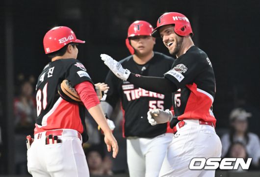 KIA 위즈덤이 홈런을 터트리고 축하를 받고 있다./OSEN DB