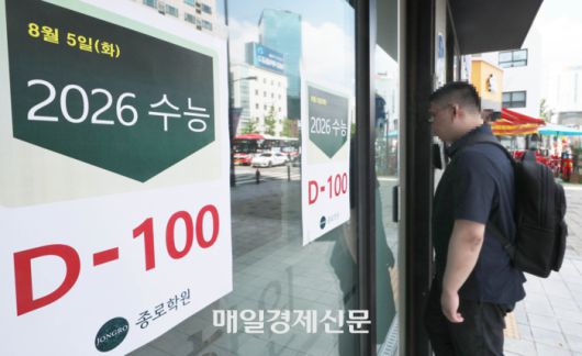 2026학년도 대학수학능력시험 100일인 지난 4일 서울 마포구 종로학원 강북본원에 ‘수능 ’D-100‘ 안내문이 게시돼 있다. [이충우기자] |