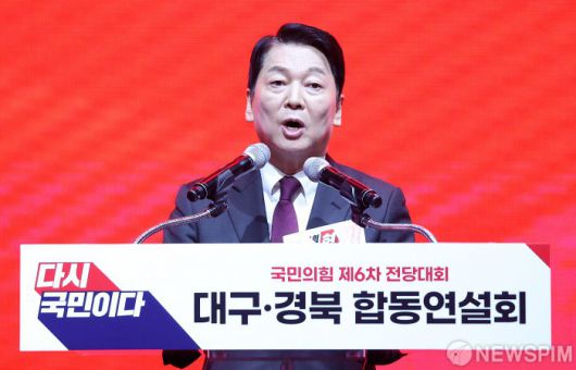 [대구=뉴스핌] 정일구 기자 = 안철수 국민의힘 대표 후보가 8일 오후 대구 엑스코 컨벤션홀에서 열린 국민의힘 제6차 전당대회 대구·경북 합동연설회에서 정견발표를 하고 있다. 2025.08.08 mironj19@newspim.com |