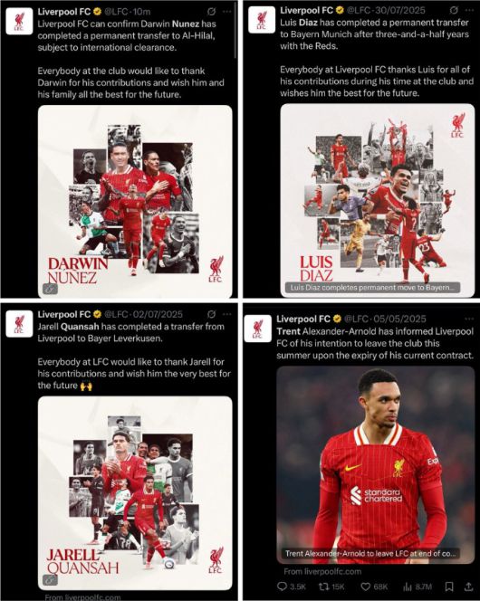 현지에선 누녜스 이적보다 더 큰 화제다. 리버풀 SNS에 오른 누녜스와 디아스, 콴사, 알렉산더아놀드의 마지막 게시물을 비교한 텍스트에 팬들 시선이 쏠리고 있다.