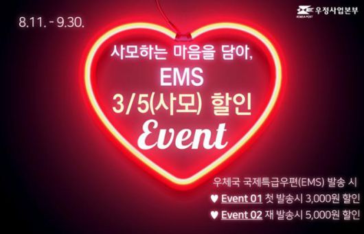 10일 과학기술정보통신부 우정사업본부는 11일부터 9월 30일까지 EMS 이용 고객을 대상으로 '3/5(사모) 할인' 이벤트를 실시한다고 밝혔다. 행사 기간 처음 EMS를 보내는 고객에게 3,000원을, 2회 이상 이용 고객에겐 5,000원의 할인 혜택을 제공한다. 할인 금액의 앞자리 숫자를 따와 이벤트명을 정했고, 멀리 있는 이들을 생각하는 마음을 의미하는 '사모(思慕)'의 의미도 담았다.