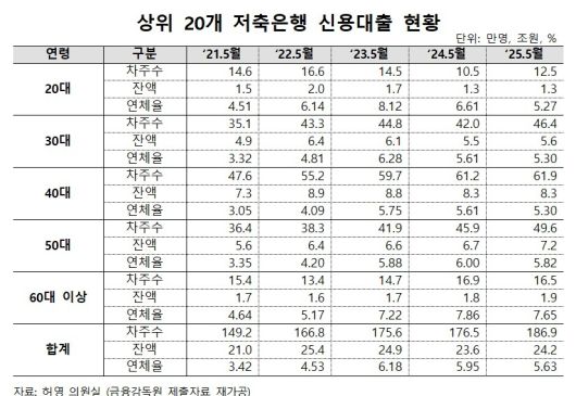 특히 최근 2금융권에서 60대 이상 고령층의 대출 연체율이 가파르게 상승하면서 고령층의 자금난이 사회 구조적 문제로 지적된다. 올해 5월 말 기준 저축은행 신용대출의 60세 이상 차주 연체율은 7.65%로 집계됐다. 이는 2021년 같은 시점의 4.64%에서 3.01%포인트 증가한 수치다 . 카드론 연체율은 같은 기간 2.10% 에서 3.07% 로, 캐피탈 신용대출 연체율은 3.52%에서 5.46%로 각각 상승했다 .