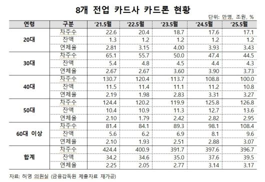 고금리와 경기 불황 속에서 카드론과 신용대출 잔액과 연체율은 오히려 증가했다. 국회 정무위원회 소속 허영 더불어민주당 의원실이 금융감독원에서 제출받은 8개 전업카드사(신한·현대·삼성·KB국민·롯데·우리·하나·BC카드)의 카드론 현황 자료에 따르면 카드론 잔액은 34조2000억원에서 39조5000억원으로 5조원 이상 뛰었다. 카드론 연체율도 2.25%에서 3.17%로 높아졌다.