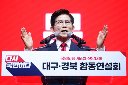 김문수 국민의힘 당 대표 후보가 8일 오후 대구 북구 엑스코에서 열린 국민의힘 제6차 전당대회 대구·경북 합동연설회에서 정견발표를 하고 있다. 뉴스1 |