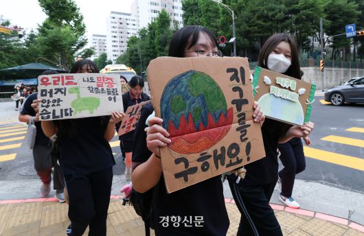 ‘2025 중랑학생기후행진’에 참가한 학생들이 기후위기 대응을 촉구하는 손팻말을 들고 있다. 권도현 기자 |