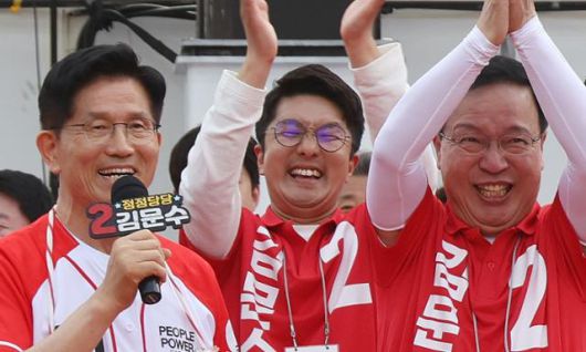 고석 국민의힘 용인병 당협위원장(맨 오른쪽)이 5월 26일 김문수 국민의힘 대선 후보의 집중유세에서 손을 머리 위로 들어 박수를 치고 있다. 용인=정다빈 기자 |
