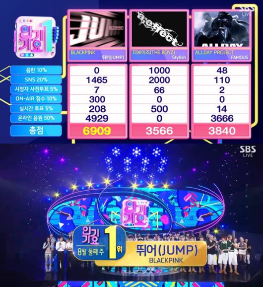 10일 방송된 SBS 음악방송 '인기가요'에서는 블랙핑크 '뛰어', 더보이즈 '스타일리쉬', 올데이프로젝트 '페이머스'가 1위 후보에 올랐다.