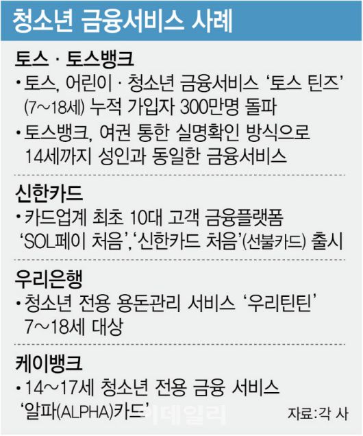 금융권 관계자는 “은행과 카드사 등은 10대 전용 서비스를 통한 고객 선점으로, 성인이 된 이후에도 계속 서비스를 이용하는 ‘락인 효과’를 노리고 있다”며 “디지털·IT에 익숙하고 재미를 추구하는 알파세대를 잡기 위한 다양한 10대 전용 금융서비스가 계속 시도될 것”이라고 말했다.