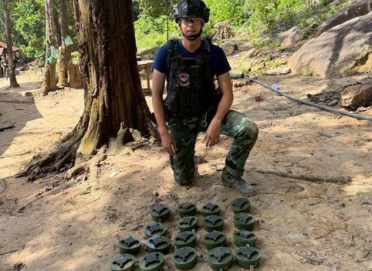 4일 태국 육군 공병대 소속 병사가 동부 시사껫주 칸타랄락에서 발견, 해체한 대인 지뢰를 공개하고 있다. 태국 측은 해당 지뢰를 캄보디아가 설치했다고 주장한다. 태국 왕립군 제공