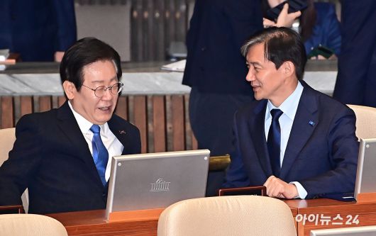 이재명 더불어민주당 대표와 조국 조국혁신당 대표가 2024년 9월 2일 오후 서울 여의도 국회 본회의장에서 열린 국회 개원식 겸 제418회 국회(정기회) 개회식에서 대화를 하고 있다. [사진=곽영래 기자] |