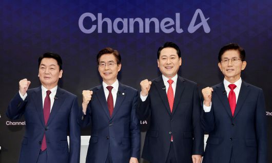 웃고는 있지만… 국민의힘 8·22 전당대회에 출마한 당대표 후보들이 10일 서울 종로구 채널A 스튜디오에서 열린 첫 방송토론회에 앞서 기념 촬영을 하고 있다. 왼쪽부터 안철수, 조경태, 장동혁, 김문수 후보. 국회사진기자단 |