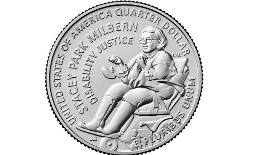 동전의 둥근 테두리를 따라서는 ‘DISABILITY JUSTICE'(장애인의 정의)라는 문구와 밀번의 이름인 ‘Stacey Park Milburn'이 쓰여 있다.