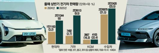 10일 현대차그룹에 따르면 올해 상반기 현대차·기아는 국내 시장에서 총 63만1323대의 차량을 판매했다. 이 중 전기차 판매는 4만7457대(포터·ST1·봉고 등 상용차 제외)로 전체 판매 비중의 7.5%를 차지했다. 이는 지난해 상반기 전기차 판매량 1만8645대(판매 비중 3%)에 비해 155% 증가한 수치다.