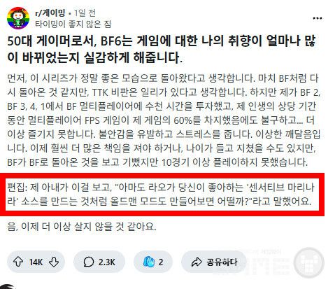 레딧 커뮤니티에서 한 50대 게이머의 솔직한 고백이 화제다. "50대 게이머로서 배틀필드6는 내 게임 취향이 얼마나 많이 바뀌었는지 실감하게 했다"는 포스트가 하루 만에 1,400개 추천과 2,300개 댓글을 기록했다.