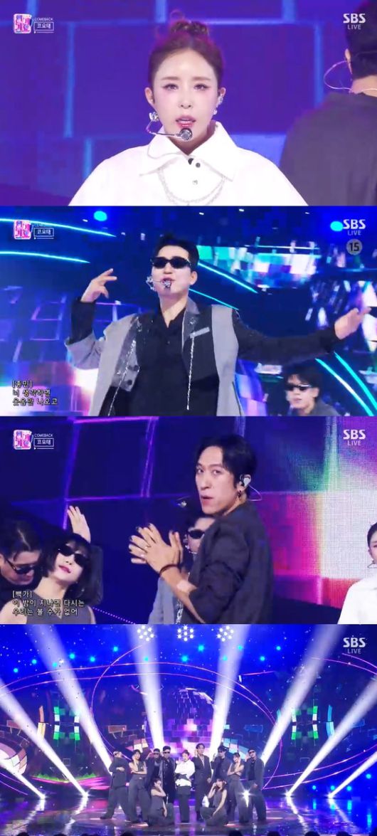 코요태(김종민, 신지, 빽가)는 10일 오후 방송된 SBS '인기가요'에 출연, 신곡 '콜미' 무대를 펼치며, 화려한 귀환을 알렸다.