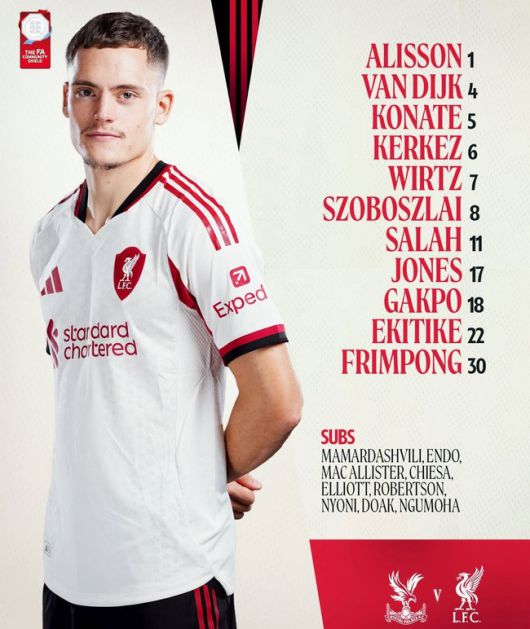 리버풀은 4-2-3-1 포메이션을 가동했다. 최전방에 위고 에키티케가 위치한다. 2선에 코디 각포, 플로리안 비르츠, 모하메드 살라가 지원한다. 중원 투 미들은 도미니크 소보슬러이와 커티 존스가 구축한다. 포백은 밀로시 케르케즈, 버질 반 다이크, 이브라히마 코나테, 제레미 프림퐁이 형성한다. 골문은 알리송이 지킨다.