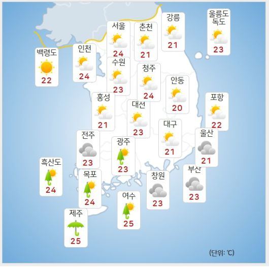 최고 기온은 △서울 31도 △인천 30도 △춘천 31도 △강릉 28도 △대전 30도 △대구 29도 △전주 29도 △광주 28도 △부산 28도 △제주 30도 △울릉도 독도 27도로 예상된다.