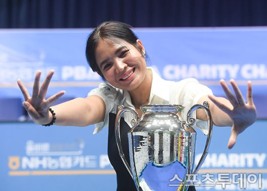 [고양(경기)=스포츠투데이 팽현준 기자] 10일 경기도 고양 킨텍스 PBA스타디움에서 열린 'NH농협카드 LPBA 채리티 챔피언십' 김민아와 스롱 피아비의 결승, 우승을 차지한 스롱 피아비가 포즈를 취하고 있다. 2025.08.10. [스포츠투데이 팽현준 기자 sports@stoo.com]