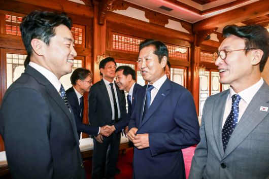 김민석 국무총리와 정청래 더불어민주당 대표, 강훈식 대통령비서실장(앞줄 오른쪽부터)이 10일 오후 고위당정협의회에서 대화를 나누고 있다. 정 대표는 지난 2일 취임 후 고위당정협의회에 처음 참석해 “당은 정부가 잘한 것은 공개적으로 잘했다고 하고 잘못한 것은 비공개적으로 지적하고 개선하는 데 초점을 맞추겠다”며 “당·정·대가 하나의 심장으로 뛰겠다”고 말했다.