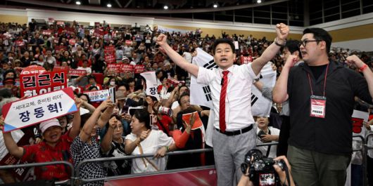 전한길 전 한국사 강사가 지난 8일 대구 북구 엑스코에서 열린 국민의힘 제6차 전당대회 대구·경북 합동연설회에서 특정 후보를 지지하며 찬탄(탄핵 찬성)파 후보가 등장할 때마다 ‘배신자’란 구호를 외치고 있다. /사진=뉴시스 |