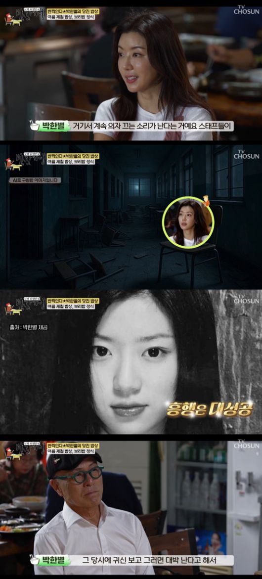 박한별은 "폐교에서 촬영을 했다. 책상 걸상이 모두 가득차서 사람이 들어갈 공간이 없었다. 근데 스태프들이 의자 끄는 소리가 난다고 하더라"며 "그래서 그 당시에 귀신 보고 그러면 대박 난다고 해서 혼자 밤에 가서 복도 앞에 앉아 있었다. 하지만 소리는 듣지 못했다"고 서늘했던 순간을 밝혔다.