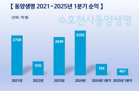 동양생명 킥스비율은 2023년 193.4%에서 2024년 155.5%로, 2025년 1분기는 127.2%로 권고치인 130% 아래로 하락한 상태다. 동양생명은 경과조치를 신청하지 않아 금리 인하 등 제도 변경 영향 폭이 크게 나타난다.