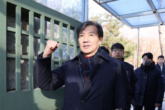 조국 전 조국혁신당 대표가 이재명 정부 출범 후 처음 열린 법무부 사면심사위원회의 광복절 특별사면 대상자 명단에 포함된 것으로 알려졌다. 사진은 조 전 대표가 지난해 12월 서울구치소로 수용되기 전 주먹을 쥐어 보이는 모습.  연합뉴스