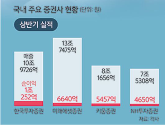 NH투자증권 역시 상반기 연결 기준 순이익이 4650억원으로, 작년 동기보다 10% 늘었다. 키움증권 순이익은 같은 기간 5457억원을 기록했다. 14.4% 증가한 수치다. 신한투자증권도 상반기 기준으로는 2589억원을 벌어 전년 동기 대비 순이익이 25% 늘었다.